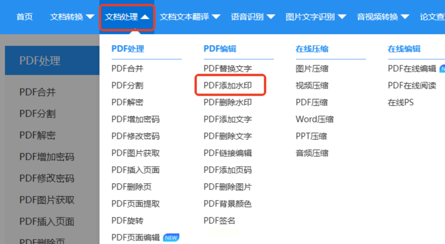 1. 打开网页:搜“迅捷PDF转换器”,点“文档处理”→“PDF添加水印”。