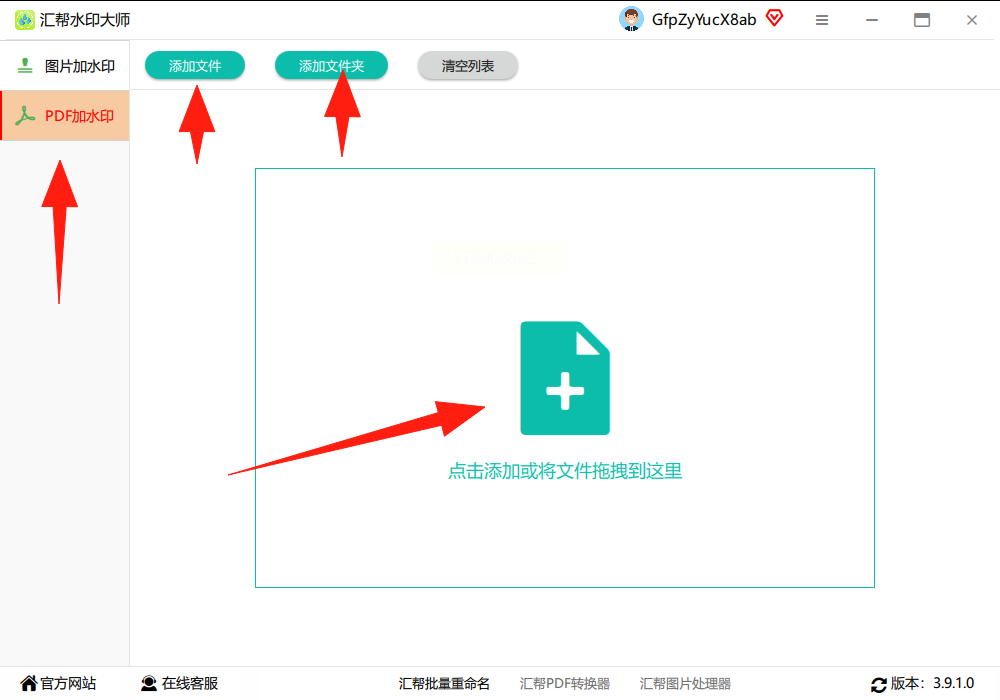 2. 点击“添加文件”,选择需要加水印的PDF,支持拖放导入;