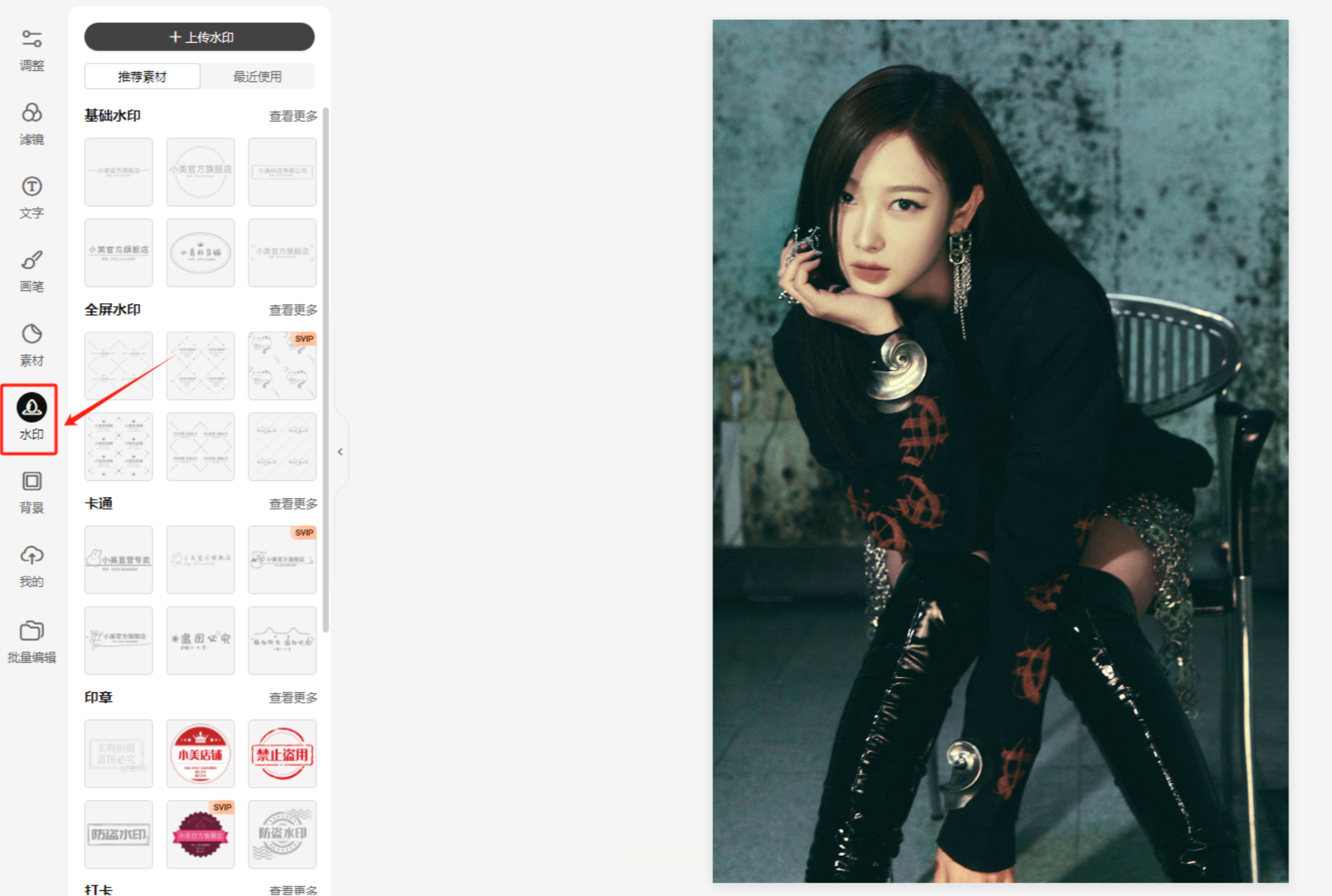 手机/网页版都能操作,选“图片编辑”→导入要加水印的图