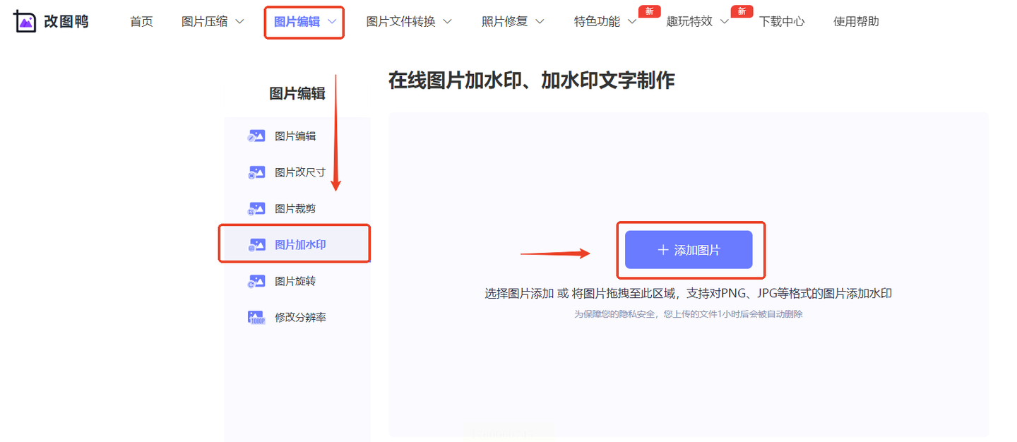步骤一:访问改图鸭网站,在网站上方导航栏找到“图片编辑”,然后在下拉菜单中选择“图片加水印”。