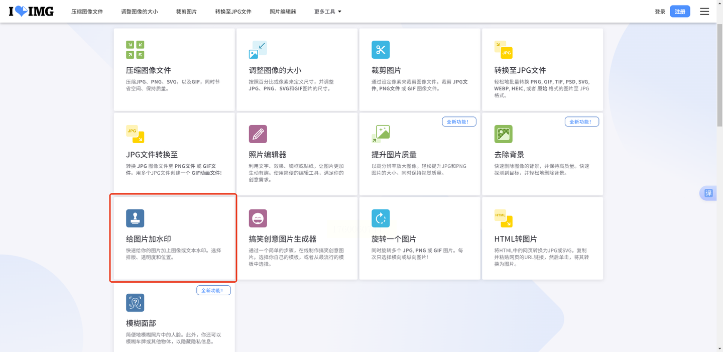 步骤一:打开它的网站首页,在功能列表里找到“给图片加水印”这个选项,点击进入。
