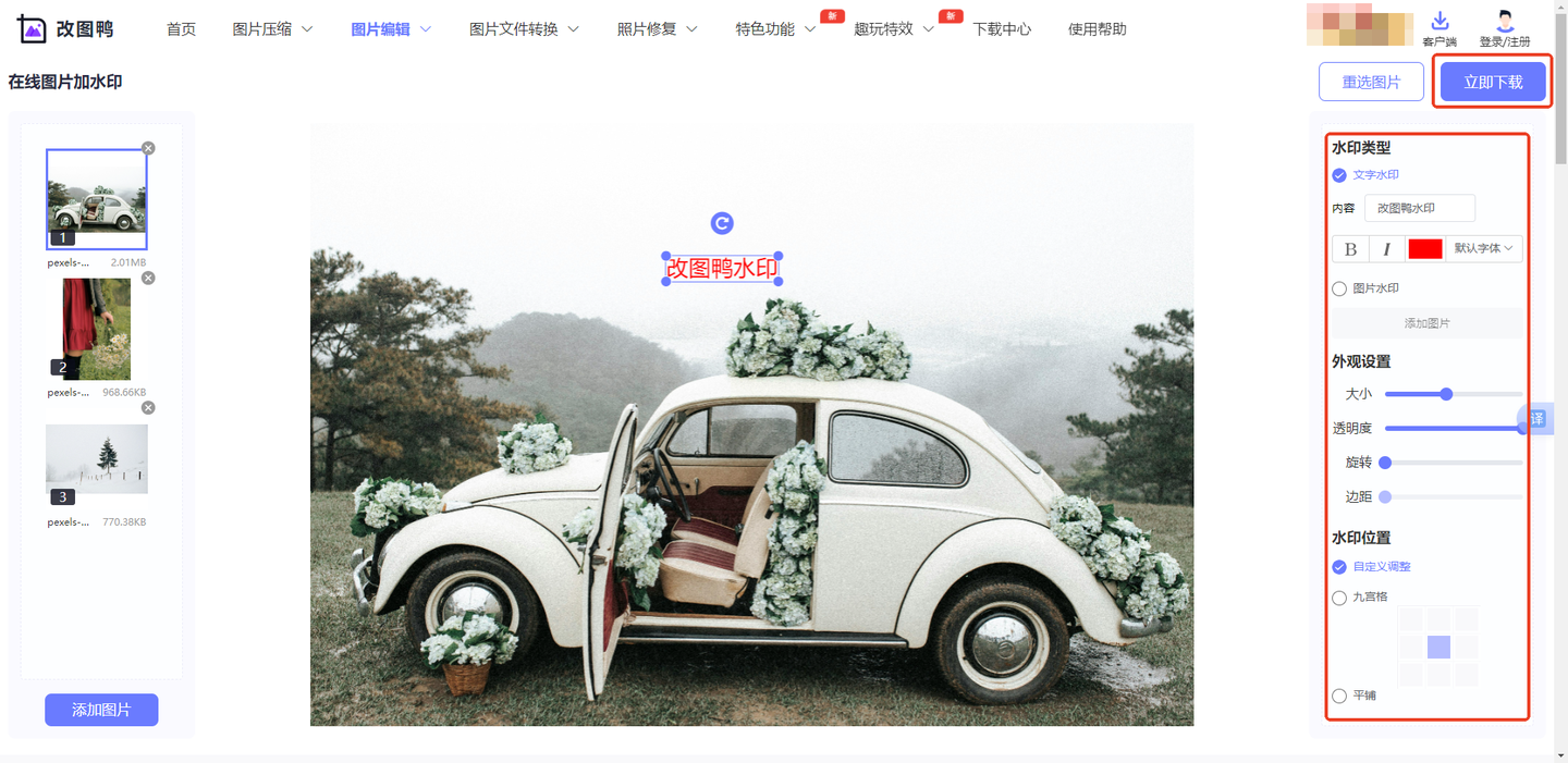 改图鸭同样是一个在线图片处理工具,它的界面比较直观,图片批量加水印功能也做得简单明了。