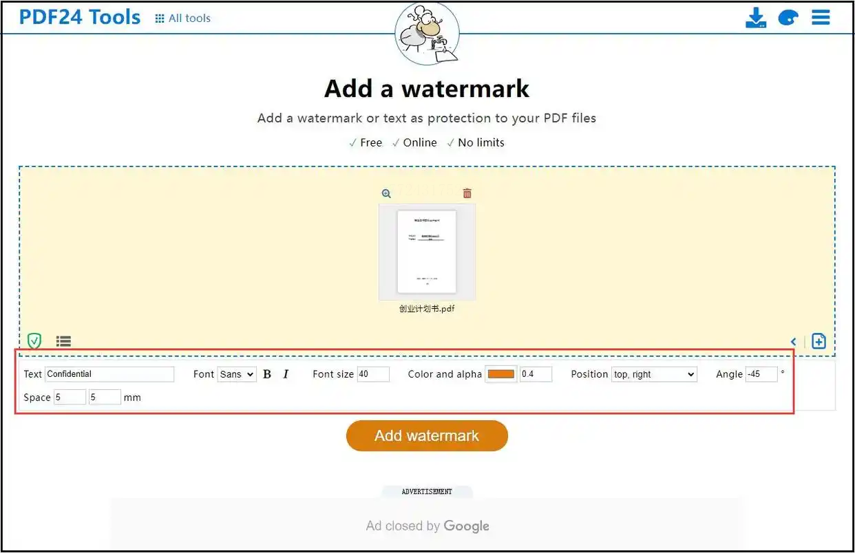 - 搜索"PDF24 Tools"官网,找到「Add Watermark」功能