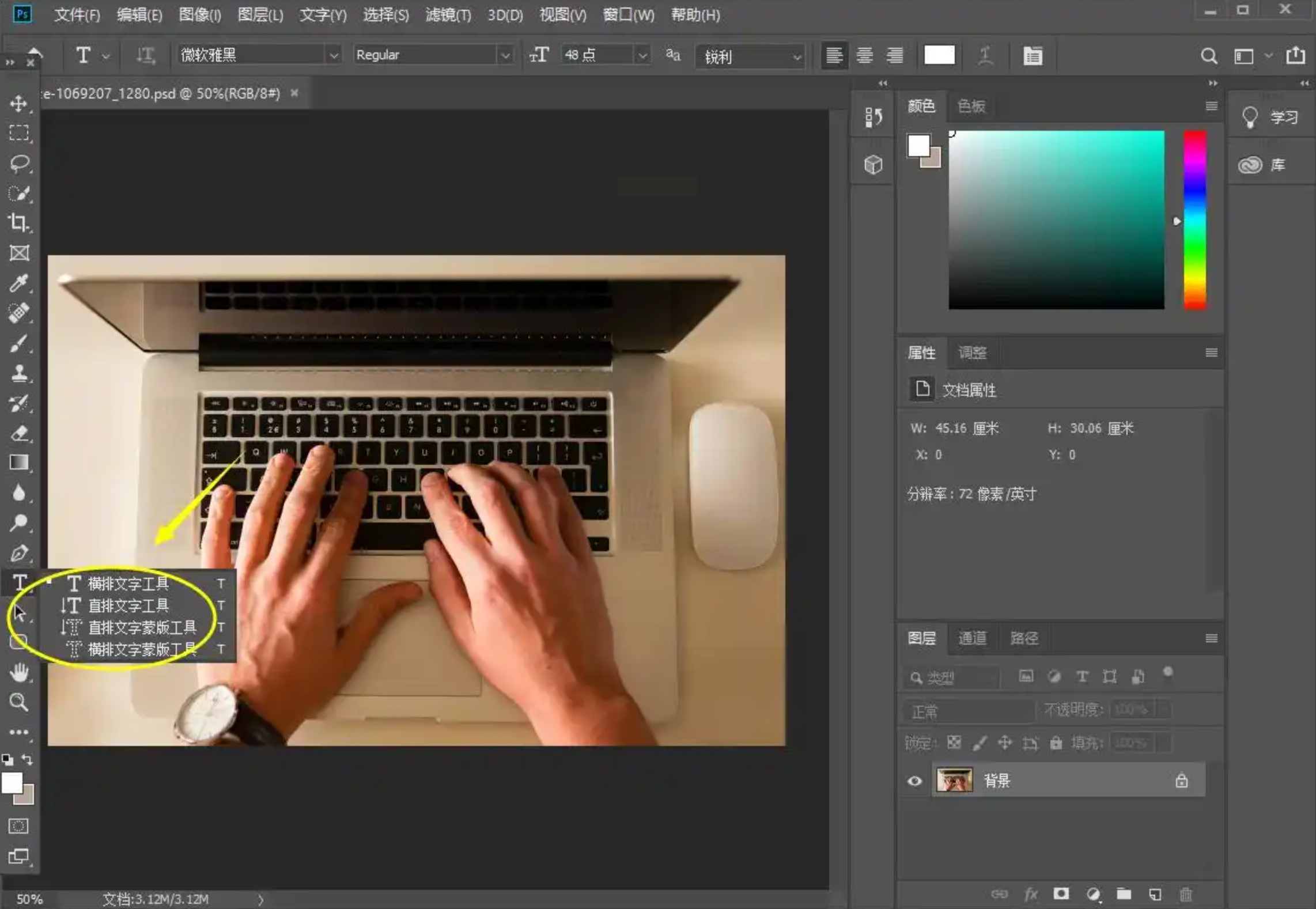 步骤二:在左侧的工具面板中找到文字工具(图标通常是一个“T”字),用鼠标在图片上你想添加水印的位置点击一下,就会出现一个文本框。