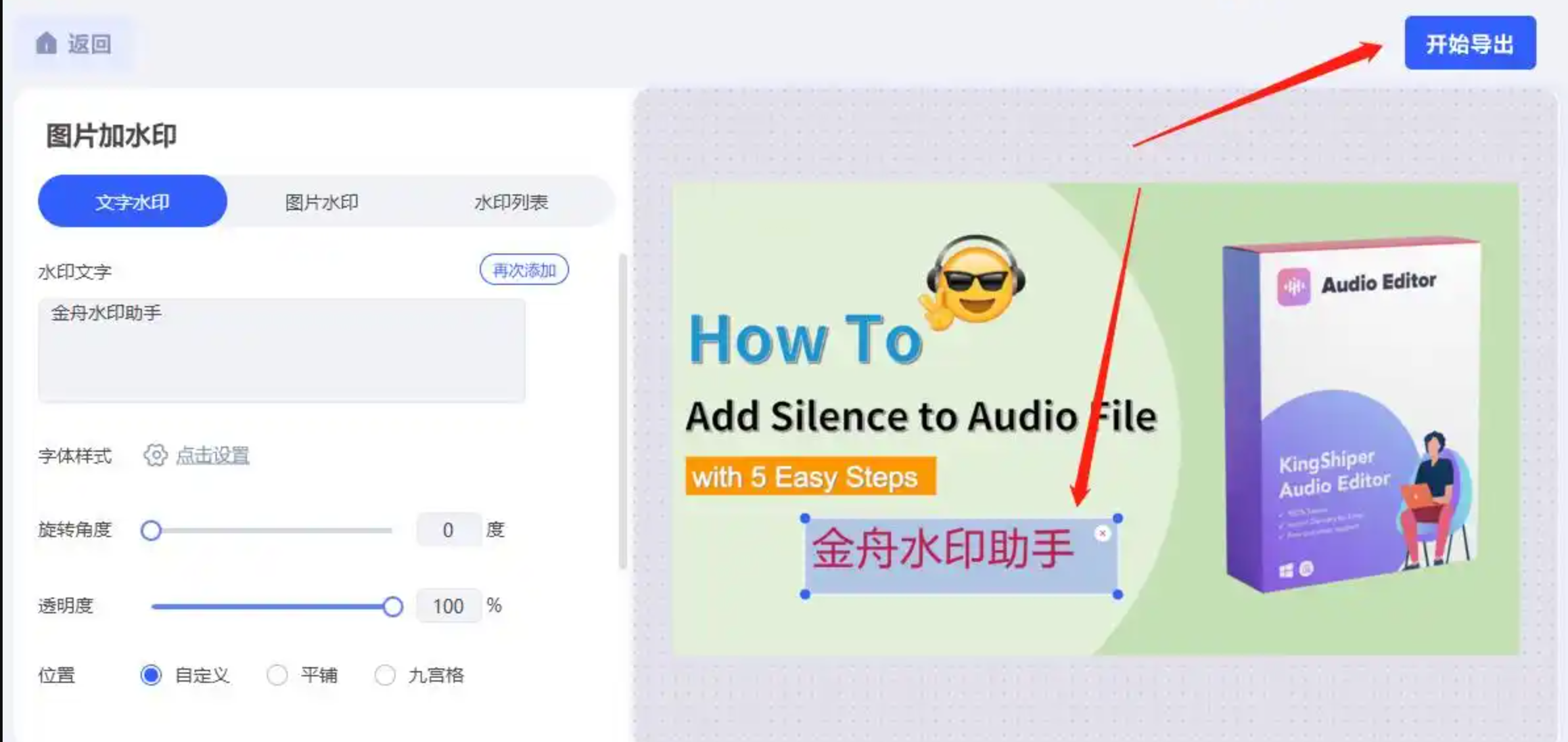 步骤三:在添加水印的类型上,你可以选择纯文字水印,也可以上传一个Logo图片作为水印。选择文字水印后,在旁边的编辑框输入内容,并详细设置其字体、颜色、布局位置等。