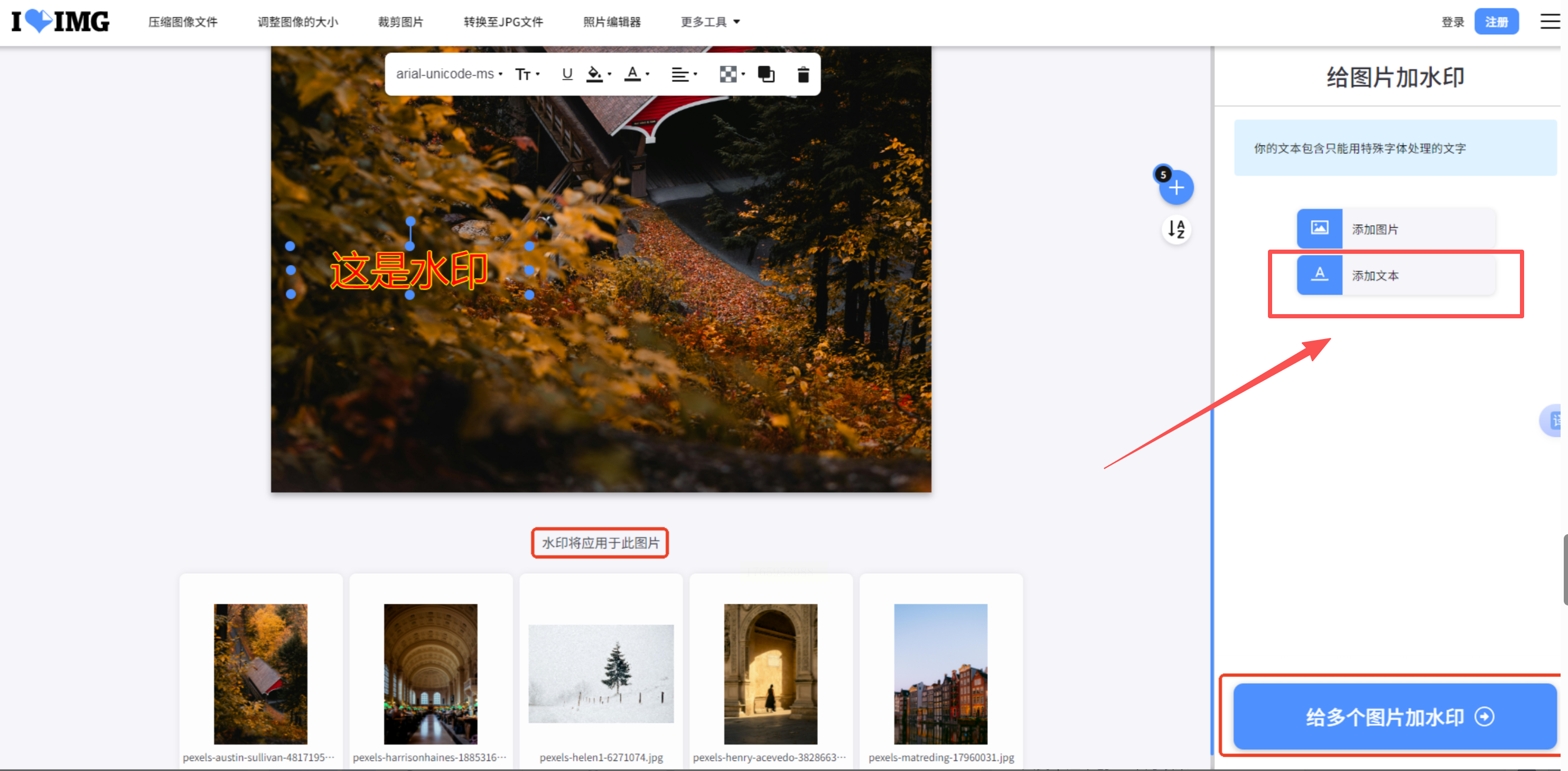 步骤三:上传成功后,页面会提供添加文字或图片水印的选项。选择文字水印,输入你的文本,然后就可以在线调整字体、大小、颜色和位置。它的优点是,对一张图片的设置可以一键应用到所有已上传的图片上,非常省事。